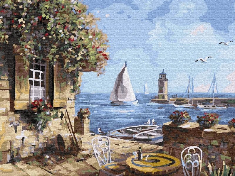 Используя кисти и краски, на холсте можно нарисовать красивый пейзаж. На берегу моря на террасе стоит столик для желающих насладиться красивым видом. Вдали стоит маяк, волны раскачивают яхты. Над голубой поверхностью моря летают чайки. Для такого творчества не требуются специальные художественные навыки. Нужно лишь следовать инструкции и время от времени сверяться с цветовой схемой рисунка.