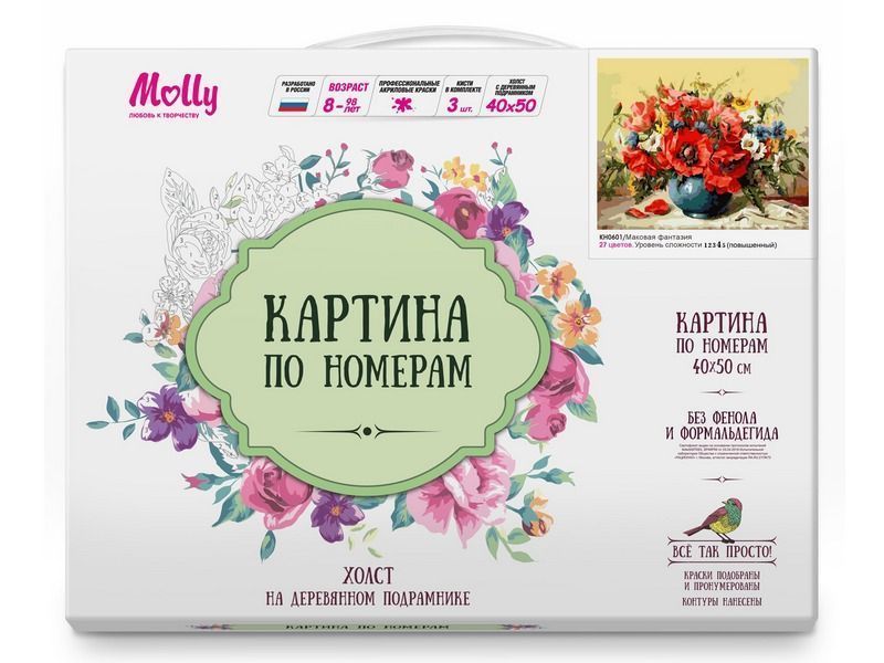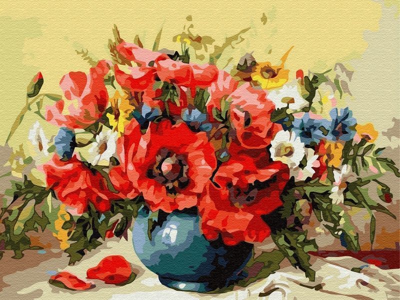 Используя кисти и краски, на холсте можно нарисовать летний букет ярких маков, белых ромашек и нежных лютиков в вазе. Плавные цветовые переходы делают картину "очень" живой, при этом рисование не представляет трудностей. Для такого творчества не требуются специальные художественные навыки. Нужно лишь следовать инструкции и время от времени сверяться с цветовой схемой рисунка.
