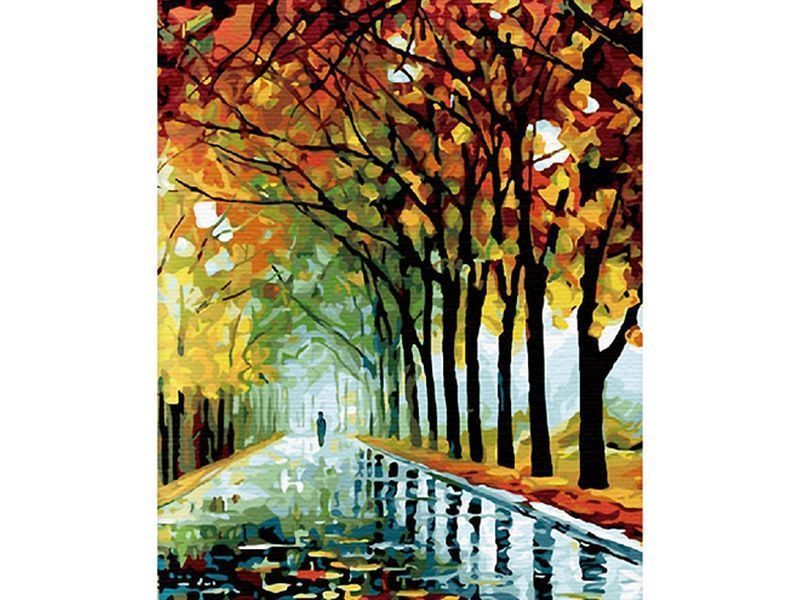 Используя кисти и краски, на холсте можно нарисовать картину Осень в парке. На ней запечатлена осенняя набережная под дождем. Листья на деревьях окрашены в ярко желтые, красные цвета. Улицы усыпана листвой. В мокрых лужах отражается небо и деревья. Для такого творчества не требуются специальные художественные навыки. Нужно лишь следовать инструкции и время от времени сверяться с цветовой схемой рисунка.