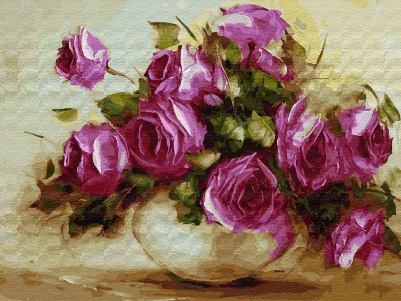 Используя кисти и краски, на холсте можно нарисовать пышный букет осенних роз в вазе. Для такого творчества не требуются специальные художественные навыки. Нужно лишь следовать инструкции и время от времени сверяться с цветовой схемой рисунка.