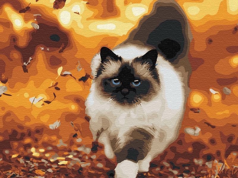 Используя кисти и краски, на холсте можно нарисовать пушистого кота с ярко-голубыми глазами. Кот медленно ступает по влажной, осенней листве. В воздухе кружат падающие листья. Для такого творчества не требуются специальные художественные навыки. Нужно лишь следовать инструкции и время от времени сверяться с цветовой схемой рисунка.