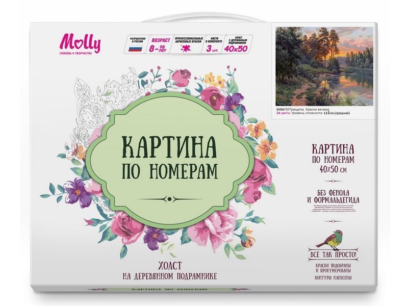 Используя кисти и краски, на холсте можно нарисовать картину Игоря Прищепы "Краски вечера" - пейзаж на закате. На полотне живописно запечатлена река, стремящаяся вдаль, закатное небо, изобилующее красками, буйная зелень вдоль реки. На ровной речной глади красиво отражается небо. Для такого творчества не требуются специальные художественные навыки. Нужно лишь следовать инструкции и время от времени сверяться с цветовой схемой рисунка.