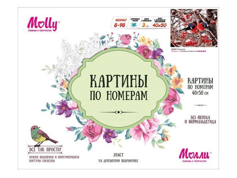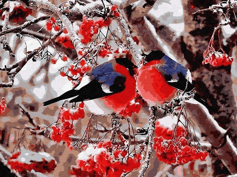 Используя кисти и краски, на холсте можно нарисовать двух красногрудых снегирей, сидящих на заснеженной ветке ярко-красной рябины. Для такого творчества не требуются специальные художественные навыки. Нужно лишь следовать инструкции и время от времени сверяться с цветовой схемой рисунка.