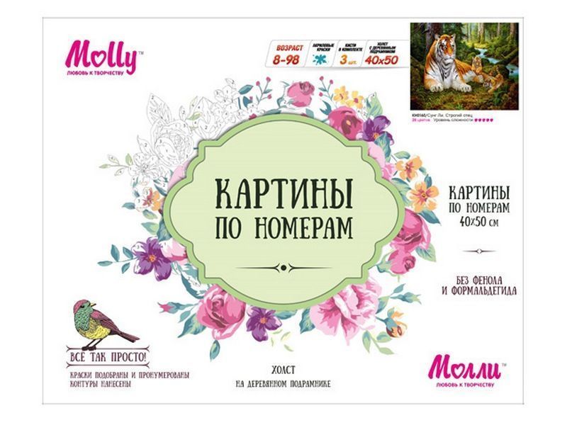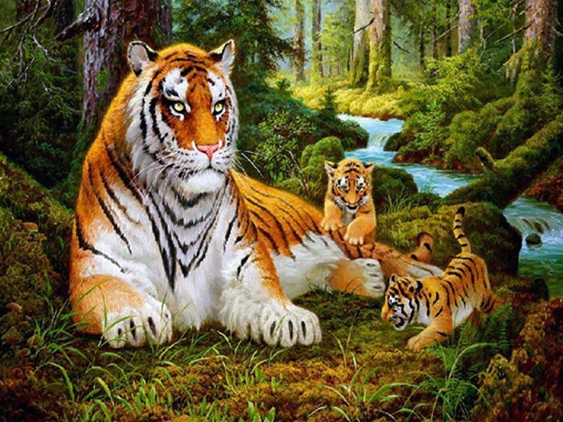 Используя кисти и краски, на холсте можно нарисовать картину известного корейского художника Сунг Ли "Строгий отец", на которой изображен тигр-отец и рядом два резвящихся тигренка. Для такого творчества не требуются специальные художественные навыки. Нужно лишь следовать инструкции и время от времени сверяться с цветовой схемой рисунка.