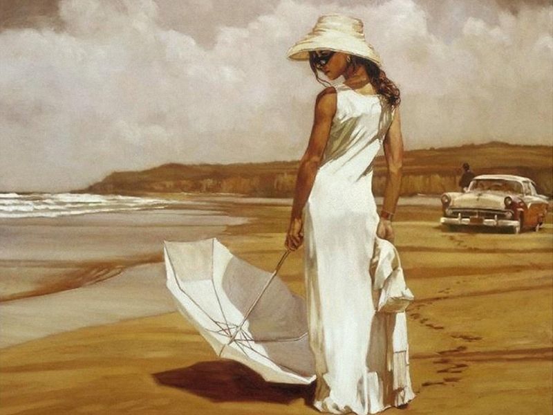 Используя кисти и краски, на холсте можно нарисовать картину в ретро стиле с изображением элегантной незнакомки, прогуливающейся вдоль берега моря. Небо затягивают облака. Для такого творчества не требуются специальные художественные навыки. Нужно лишь следовать инструкции и время от времени сверяться с цветовой схемой рисунка.