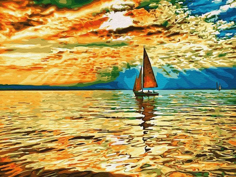 Используя кисти и краски, на холсте можно нарисовать картину с изображением парусника на закате. Для такого творчества не требуются специальные художественные навыки. Нужно лишь следовать инструкции и время от времени сверяться с цветовой схемой рисунка.
