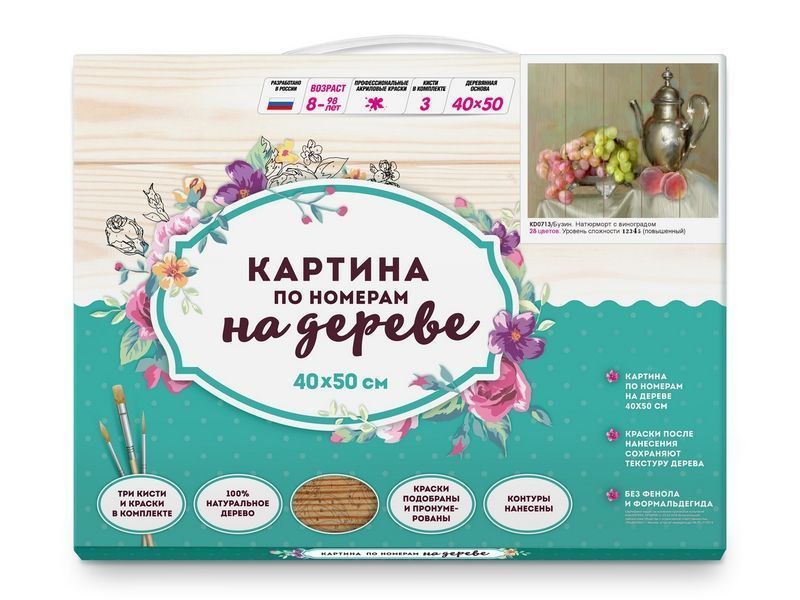 Используя кисти и краски, на основе из натурального дерева можно нарисовать картину Игоря Бузина "Натюрморт с виноградом". Серебряный кувшин, грозди винограда и спелые персики составляют гармоничный ансамбль на белой, атласной скатерти, укрывающей стол. Для такого творчества не требуются специальные художественные навыки. Нужно лишь следовать инструкции и время от времени сверяться с цветовой схемой рисунка. Для выделения отдельных зон есть 2 баночки лака. В подарок - держатель для красок. В наборе есть крепление на стену.