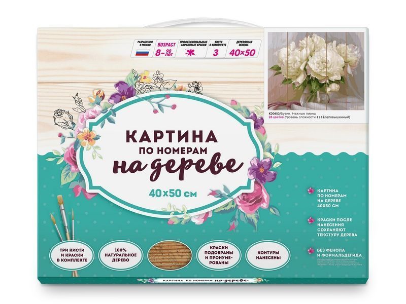 Используя кисти и краски, на основе из натурального дерева можно нарисовать картину Игоря Бузина "Нежные пионы" - роскошный букет пионов нежно-белого в вазе. Для такого творчества не требуются специальные художественные навыки. Нужно лишь следовать инструкции и время от времени сверяться с цветовой схемой рисунка. Для выделения отдельных зон есть 2 баночки лака. В подарок - держатель для красок. В наборе есть крепление на стену.