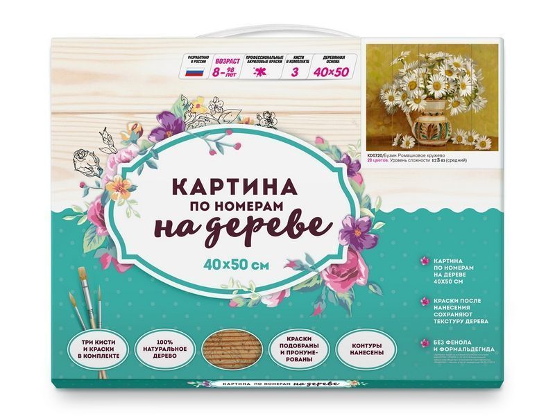Используя кисти и краски, на основе из натурального дерева можно нарисовать картину Игоря Бузина "Ромашковое кружево" - букет белоснежных ромашек в вазе. Для такого творчества не требуются специальные художественные навыки. Нужно лишь следовать инструкции и время от времени сверяться с цветовой схемой рисунка. Для выделения отдельных зон есть 2 баночки лака. В подарок - держатель для красок. В наборе есть крепление на стену.