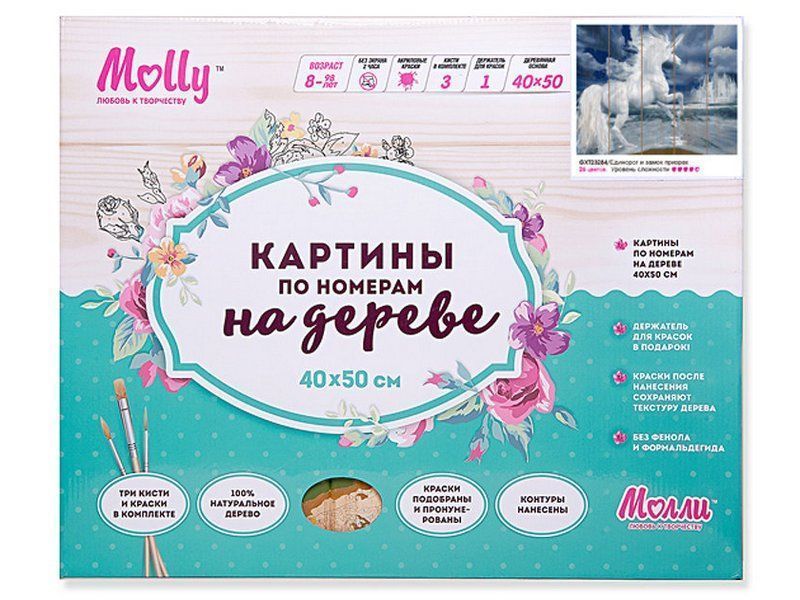 Используя кисти и краски, на основе из натурального дерева можно нарисовать красивого единорога на фоне призрачного замка. Для такого творчества не требуются специальные художественные навыки. Нужно лишь следовать инструкции и время от времени сверяться с цветовой схемой рисунка. Для выделения отдельных зон есть 2 баночки лака. В подарок - держатель для красок. В наборе есть крепление на стену.