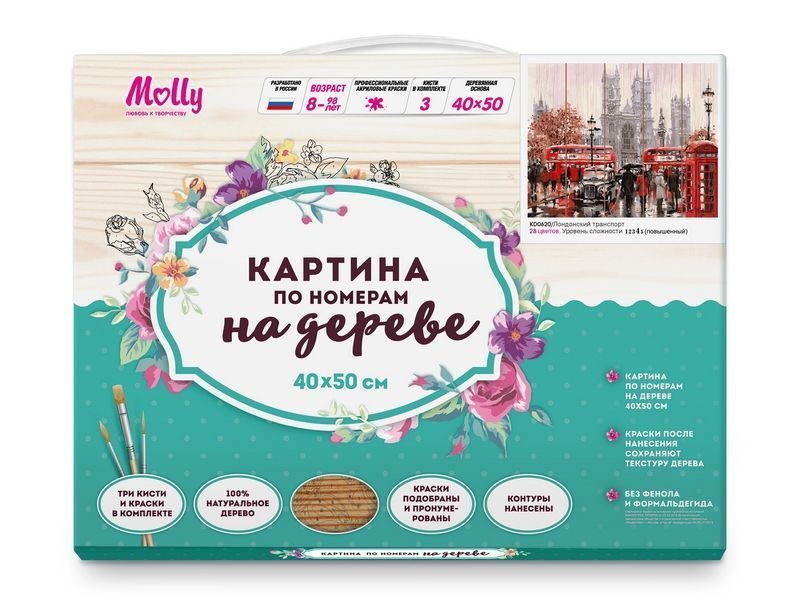 Используя кисти и краски, на основе из натурального дерева можно нарисовать городской пейзаж с известными атрибутами Лондона: знаменитый красный двухэтажный автобус, английские фонари и телефонная будка. Для такого творчества не требуются специальные художественные навыки. Нужно лишь следовать инструкции и время от времени сверяться с цветовой схемой рисунка. Для выделения отдельных зон есть 2 баночки лака. В подарок - держатель для красок. В наборе есть крепление на стену.