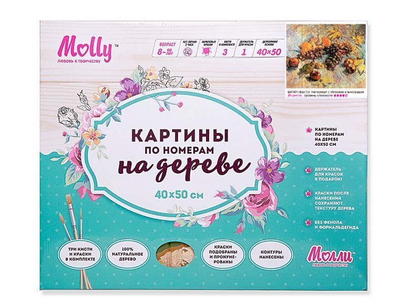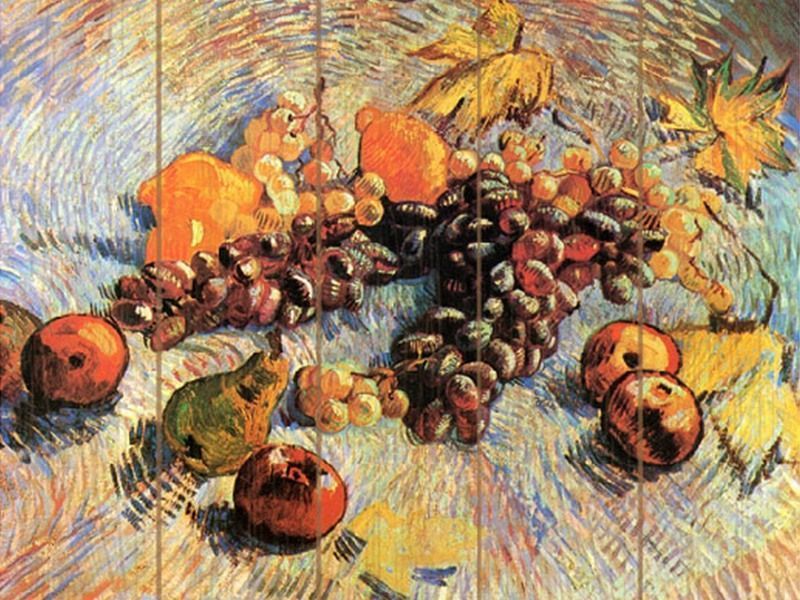 Используя кисти и краски, на основе из натурального дерева можно нарисовать знаменитую картину постимпрессиониста Винсента Ван Гога "Натюрморт с яблоками и виноградом". Картина была создана в 1887 году. На картине изображены груши, яблоки, лимоны, гроздь синего винограда.