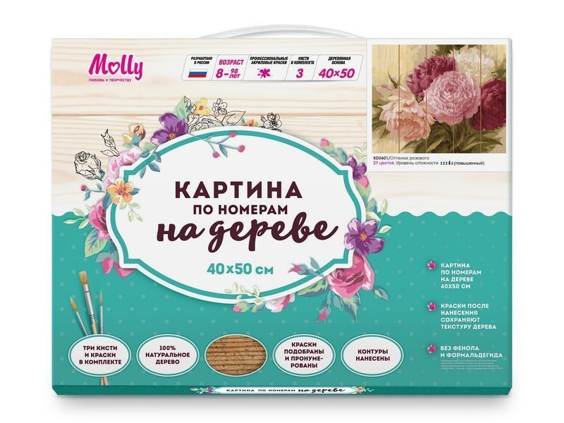 Используя кисти и краски, на основе из натурального дерева можно нарисовать букет пышных пионов от нежно розового до яркого. Для такого творчества не требуются специальные художественные навыки. Нужно лишь следовать инструкции и время от времени сверяться с цветовой схемой рисунка. Для выделения отдельных зон есть 2 баночки лака. В подарок - держатель для красок. В наборе есть крепление на стену.