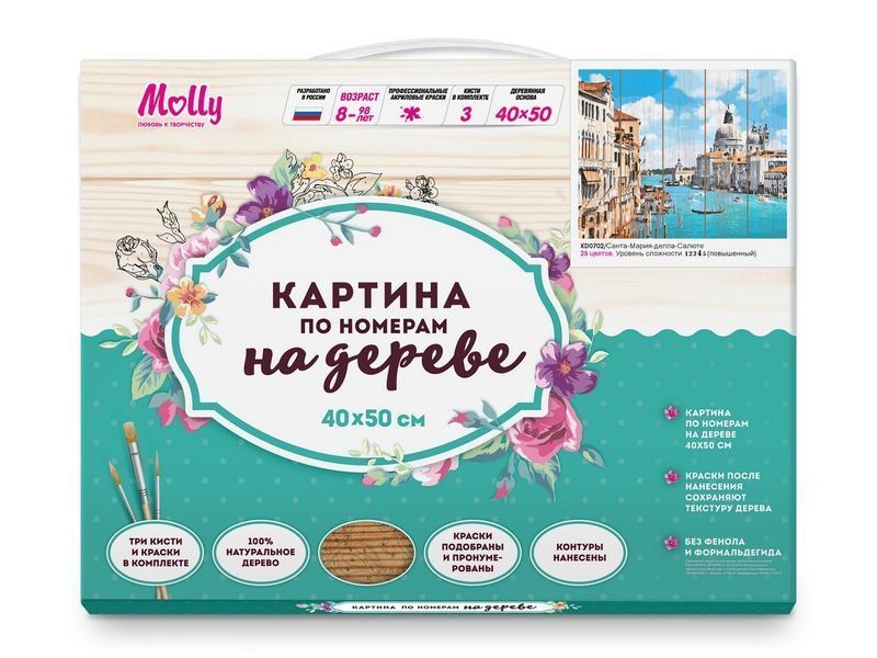 Используя кисти и краски, на основе из натурального дерева можно нарисовать собор Санта-Мария-Делла-Салюте в Венеции на Гранд канале. Эта церковь - одна из наиболее величественных и значительных в Венеции. Для такого творчества не требуются специальные художественные навыки. Нужно лишь следовать инструкции и время от времени сверяться с цветовой схемой рисунка. Для выделения отдельных зон есть 2 баночки лака. В подарок - держатель для красок. В наборе есть крепление на стену.