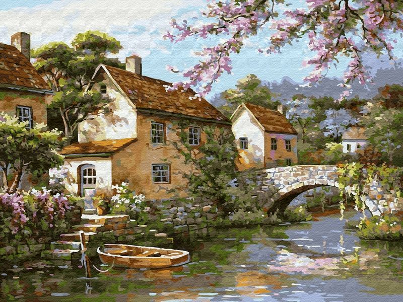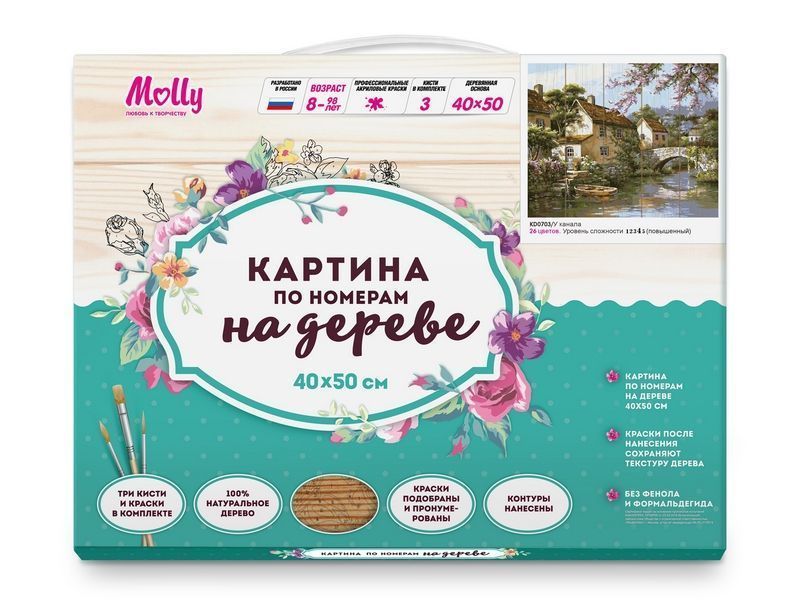Используя кисти и краски, на основе из натурального дерева можно нарисовать речной канал, мост через него и уютный домик на берегу. У причала стоит лодка, ожидающая путника. Для такого творчества не требуются специальные художественные навыки. Нужно лишь следовать инструкции и время от времени сверяться с цветовой схемой рисунка. Для выделения отдельных зон есть 2 баночки лака. В подарок - держатель для красок. В наборе есть крепление на стену.