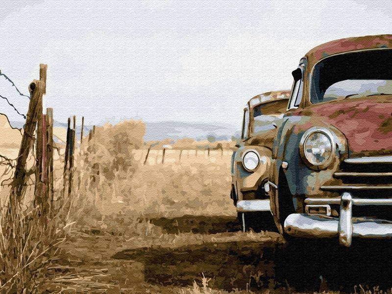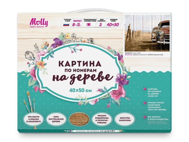Используя кисти и краски, на основе из натурального дерева можно нарисовать картину в стиле лофт, который возник в Америке в 40-х годах XX века. На картине изображены ретро автомобили на фоне загородного пейзажа. Для такого творчества не требуются специальные художественные навыки. Нужно лишь следовать инструкции и время от времени сверяться с цветовой схемой рисунка. Для выделения отдельных зон есть 2 баночки лака. В подарок - держатель для красок. В наборе есть крепление на стену.