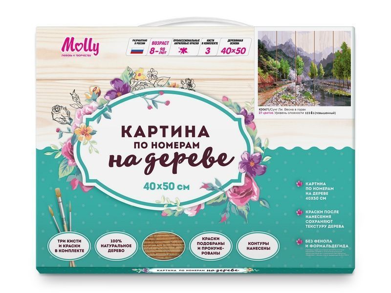 Используя кисти и краски, на основе из натурального дерева можно нарисовать картину известного корейского художника Сунг Ли, на которой изображена весна в горах. На фоне горного пейзажа виднеется цветущая сакура. Для такого творчества не требуются специальные художественные навыки. Нужно лишь следовать инструкции и время от времени сверяться с цветовой схемой рисунка. Для выделения отдельных зон есть 2 баночки лака. В подарок - держатель для красок. В наборе есть крепление на стену.