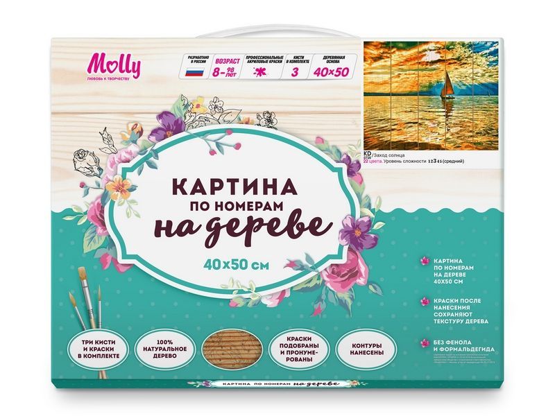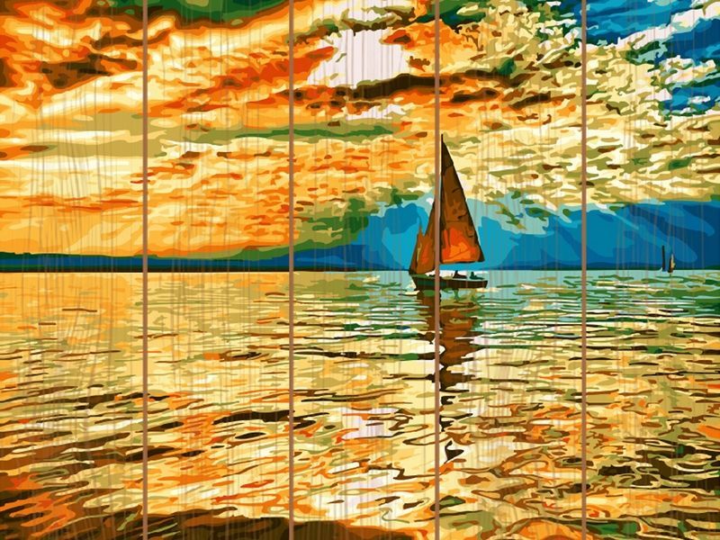 Используя кисти и краски, на основе из натурального дерева можно нарисовать картину с изображением парусника на закате. Для такого творчества не требуются специальные художественные навыки. Нужно лишь следовать инструкции и время от времени сверяться с цветовой схемой рисунка.