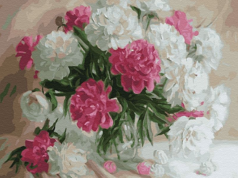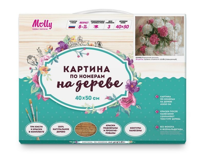 Используя кисти и краски, на основе из натурального дерева можно нарисовать букет розовых и белых пионов. Для такого творчества не требуются специальные художественные навыки. Нужно лишь следовать инструкции и время от времени сверяться с цветовой схемой рисунка. Для выделения отдельных зон есть 2 баночки лака. В подарок - держатель для красок. В наборе есть крепление на стену.
