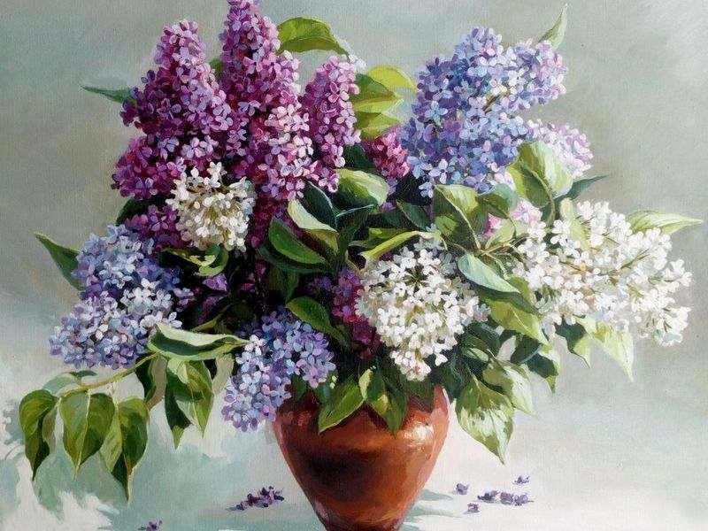 Используя кисти и краски, на холсте можно нарисовать букет разноцветной сирени в вазе. Для такого творчества не требуются специальные художественные навыки. Нужно лишь следовать инструкции и время от времени сверяться с цветовой схемой рисунка.