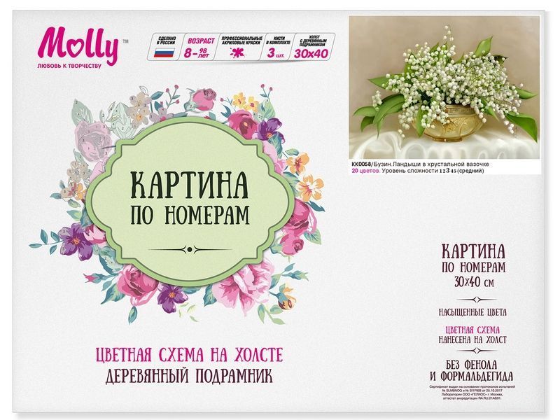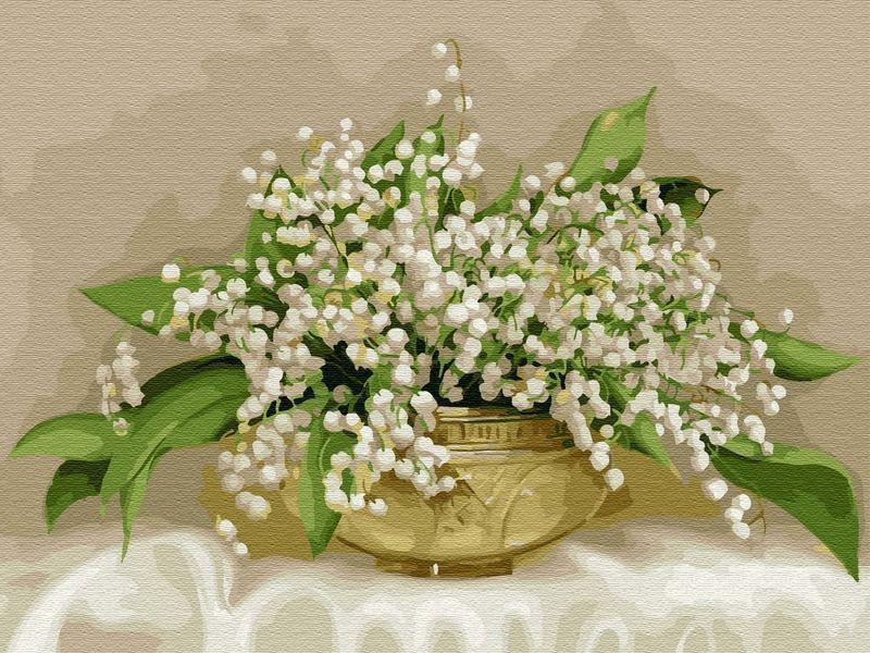 Картина по номерам с цветной схемой на холсте 30х40 Бузин. Ландыши в хрустальной вазочке (20 цветов)