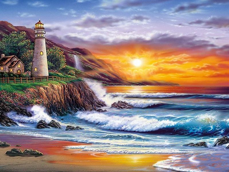 Используя кисти и краски, на холсте можно нарисовать красивый морской пейзаж с изображением маяка на фоне заката. Набегающие на берег одна за одной волны дополняют картину умиротворения. Для такого творчества не требуются специальные художественные навыки. Нужно лишь следовать инструкции и время от времени сверяться с цветовой схемой рисунка.