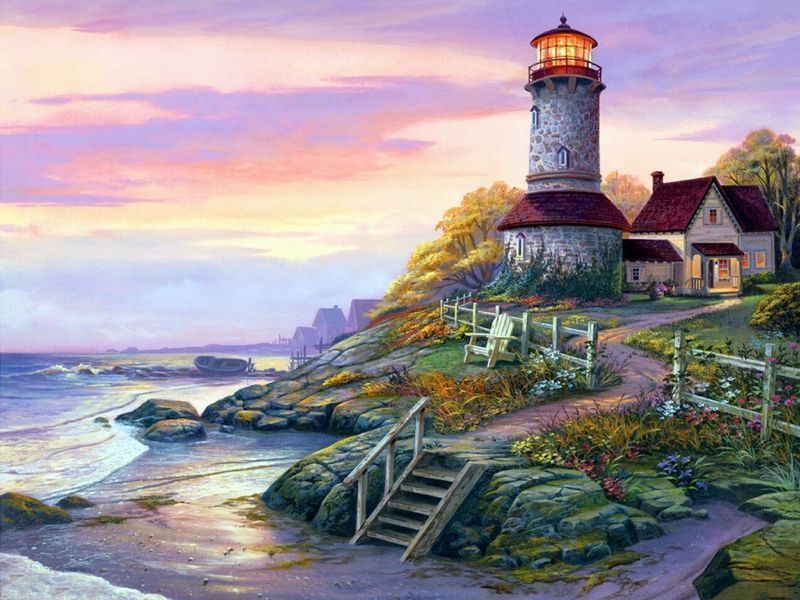 Используя кисти и краски, на холсте можно нарисовать маяк на берегу на фоне закатного неба. Для такого творчества не требуются специальные художественные навыки. Нужно лишь следовать инструкции и время от времени сверяться с цветовой схемой рисунка.