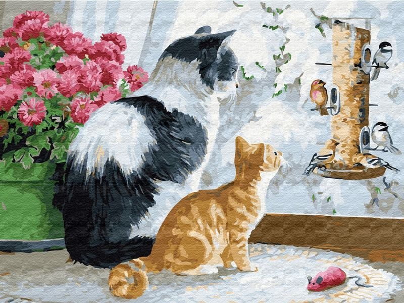 Используя кисти и краски, на холсте можно нарисовать кошку с котенком, сидящих на подоконнике. За окном - снежная зима. Скворечник, укрытый шапкой снега, окружен птицами. Маленький котенок с интересом наблюдает за происходящим за окном. Для такого творчества не требуются специальные художественные навыки. Нужно лишь следовать инструкции и время от времени сверяться с цветовой схемой рисунка.