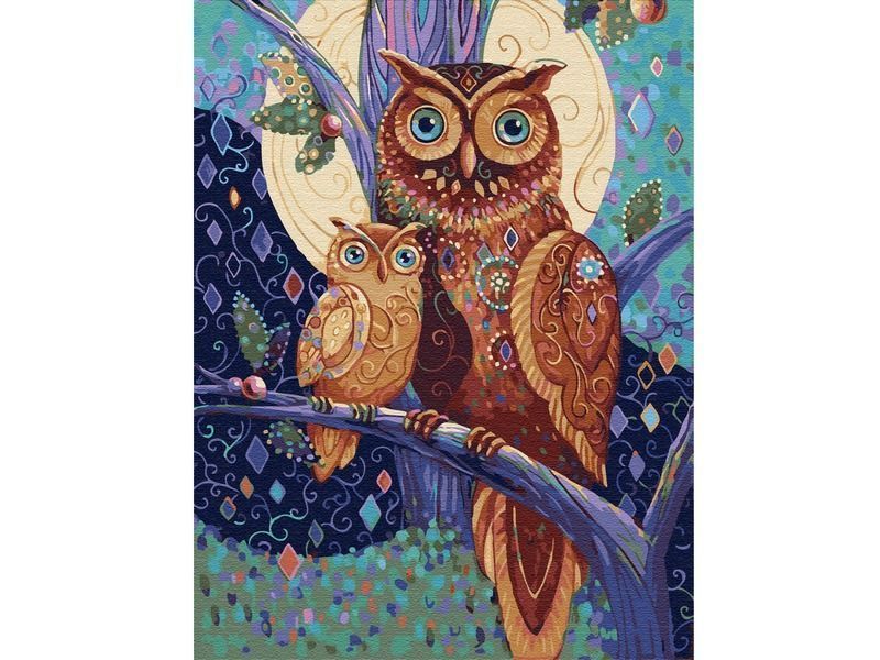 Используя кисти и краски, на холсте можно нарисовать на холсте сову и совенка, сидящих на ветке. Для такого творчества не требуются специальные художественные навыки. Нужно лишь следовать инструкции и время от времени сверяться с цветовой схемой рисунка.