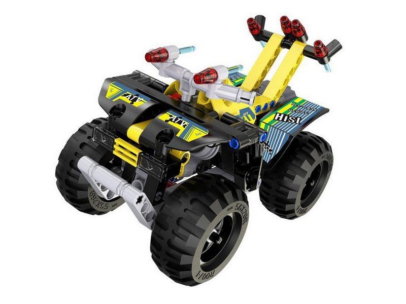 Модель квадроцикла состоит из 164 деталей. Собрать её способен даже маленький ребёнок – благодаря подробной инструкции, качественной проработке деталей и простоте сборки. Результат – ярко-жёлтый квадроцикл с резиновыми колёсами и специальными снарядами, которыми можно выстреливать. Модель снабжена инерционным механизмом: стоит «проехаться» задним ходом и отпустить квадроцикл, и он проедет сам до 10 м.