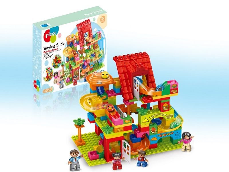 Детский конструктор Pilage Ресторан включает в себя 142 пластиковых детали. После сборки ребенок имеет возможность запускать в ресторан посетителей: разноцветные шарики скатываются по желобкам с разной скоростью. Ребенок будет часами наблюдать как шарики путешествуют через лабиринты, построенные своими руками. Для большего интереса в набор включены мини-фигурки человечков.