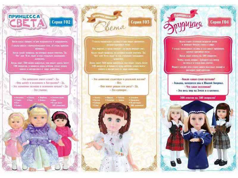 Принцесса Света умеет не только разговаривать, но и точно угадывать мысли. Загадайте животное и просто ответьте на вопросы "да", "нет", не знаю" и Света сумеет угадать, что за животное вы задумали. Она знает 300 видов животных и может задать более 100 вопросов. Такой друг не даст заскучать ребенку.
