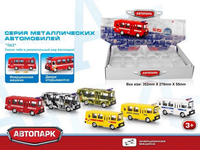 Уменьшенная копия автобуса ПАЗ, который выполнен в различных вариантах: Полиция, Такси, Дети, Вооруженные Силы, ОМОН, Пожарная охрана.