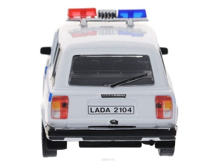 Инерционная коллекционная модель Autotime Lada 2104 - уменьшенная копия реального автомобиля. У нее вращаются колеса. Двери машинки открываются, что не может не радовать. Модель Lada 2104 имеет вариант расцветки Полиция.