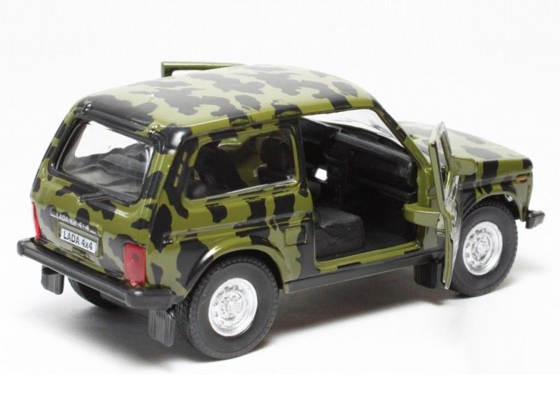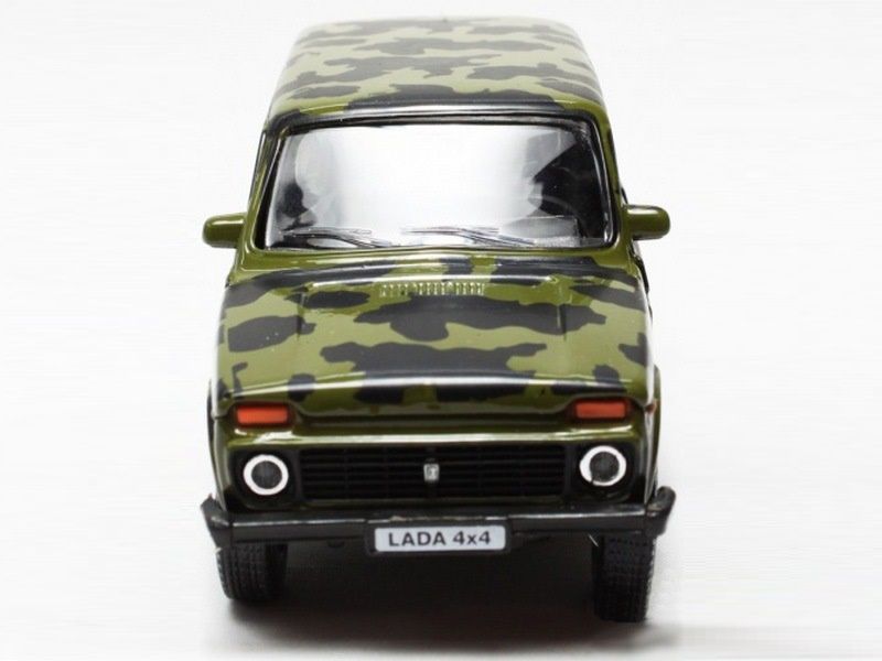 Инерционная коллекционная модель Autotime Lada 4x4 - уменьшенная копия реального автомобиля. У нее вращаются колеса. Двери машинки открываются, что позволяет рассмотреть салон изнутри в деталях. Модель Lada 4x4 окрашена в камуфляжный цвет со звездой на дверях, обозначающей принадлежность к наземным войскам.