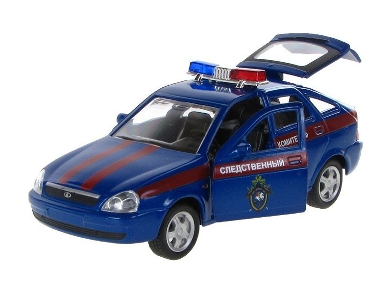 Инерционная коллекционная модель Autotime Lada Priora - уменьшенная копия реального автомобиля. Игрушка изготовлена из металла и высококлассного пластика. Уровень детализации машинки достаточно высок. У нее вращаются колеса. Двери машинки и багажник открываются, это позволяет хозяину игрушки не только посмотреть, но и потрогать салон машинки. Также ребенок сможет положить в багажник что-нибудь небольшого размера. Модель окрашена в синий цвет с маркировкой Следственного комитета Российской Федерации и декоративными проблесковыми маячками.