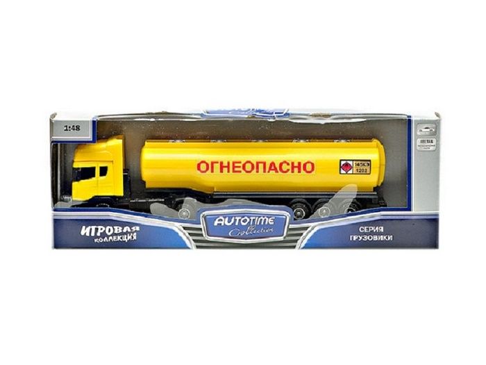 Модель оснащена инерционным механизмом, работающим по всем известному принципу - прижать к полу, откатить назад, отпустить. Модель Scania Бензовоз окрашена в желтый цвет с надписью "Огнеопасно" на цистерне.