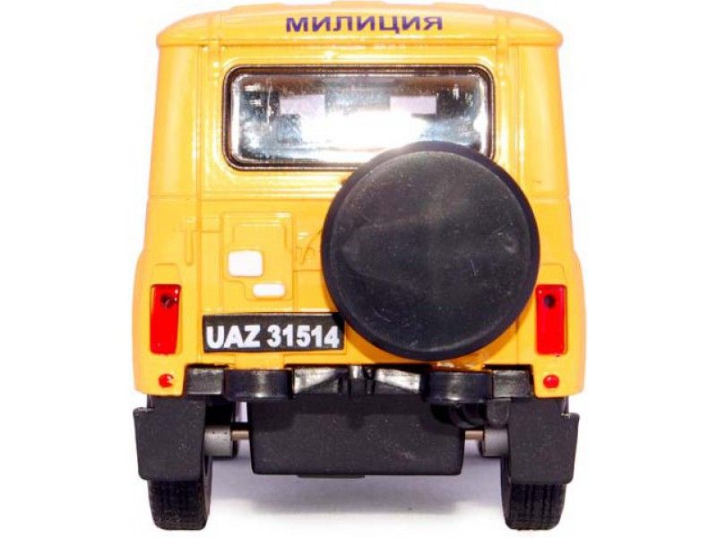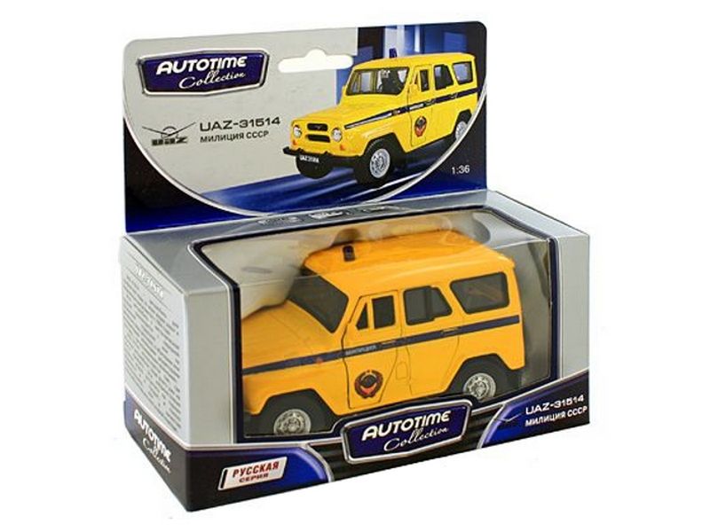 Инерционная коллекционная модель Autotime Uaz 31514 - уменьшенная копия популярного в советское время автомобиля. У нее вращаются колеса. Двери машинки открываются, что позволяет рассмотреть салон изнутри в деталях. Модель имеет расцветку милиция СССР.