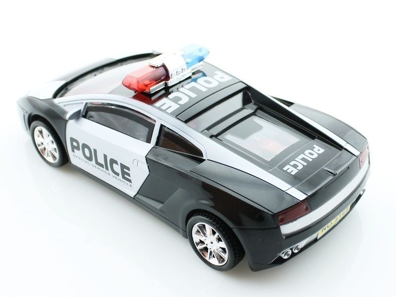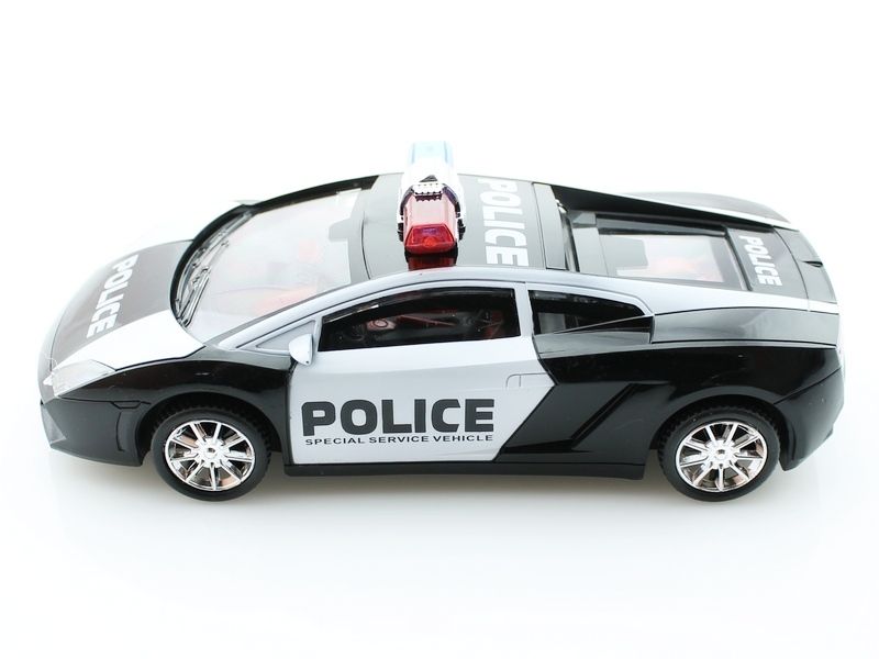 Модель выполнена в черно-белом цвете с эмблемой полиции на дверях. На крыше автомобиля установлен проблесковый маячок красно-синего цвета.