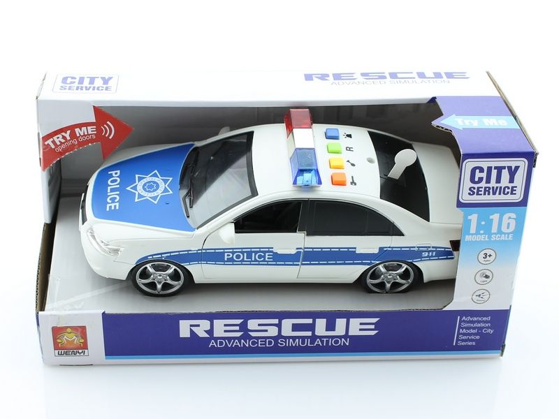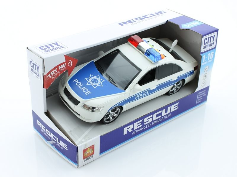 Инерционная машинка Полиция в масштабе 1/16. Двери машинки открываются, что позволяет рассмотреть салон изнутри в деталях. А свет и звук являются необходимым дополнением. Модель выполнена в белом цвете с эмблемой полиции на капоте, надписью полиция на дверях и оборудована спецсигналами на крыше. В красивой упаковочной коробке машинка может стать прекрасным подарком.