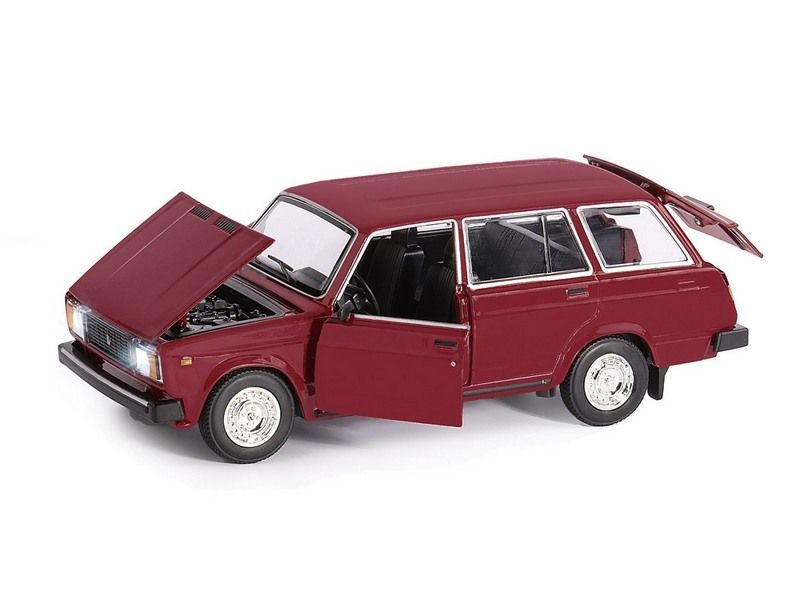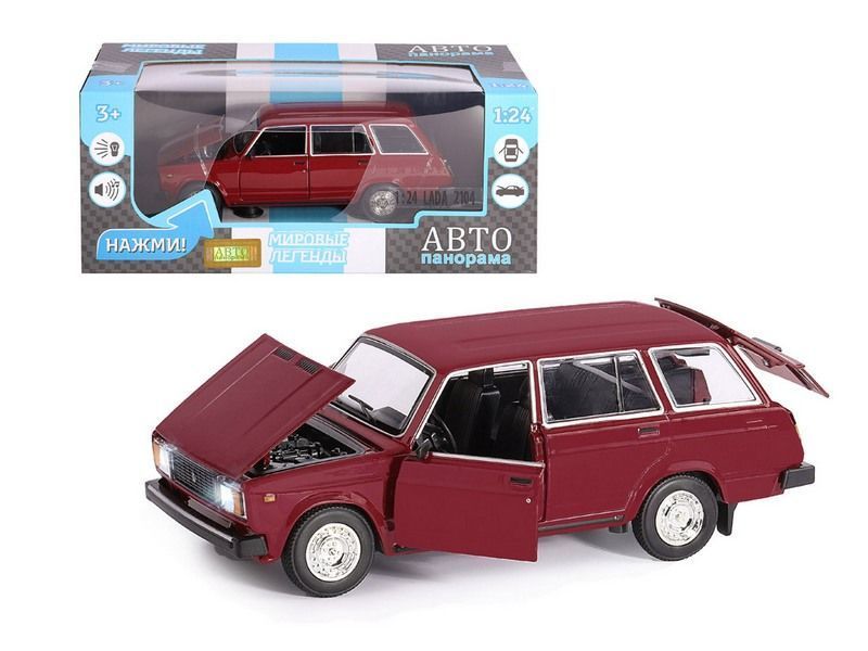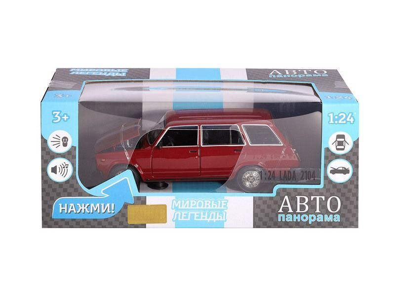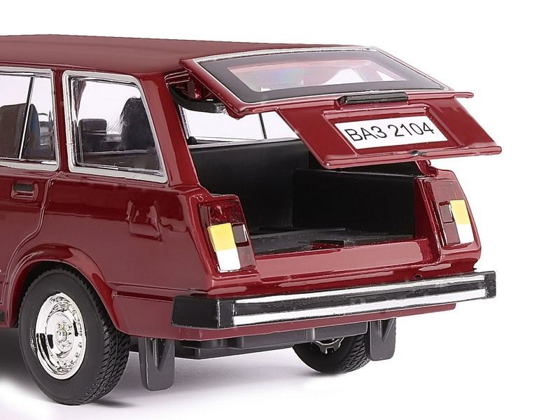 Металлическая машинка ВАЗ-2104 - сделана в стиле популярного советского автомобиля в кузове универсал с увеличенным багажным отсеком, позволявшим перевозить крупные предметы. Машинка выпущена известной компанией по производству игрушек Автопанорама. Особенность коллекции в том, что все модели изготовлены по лицензии именитых автопроизводителей.
