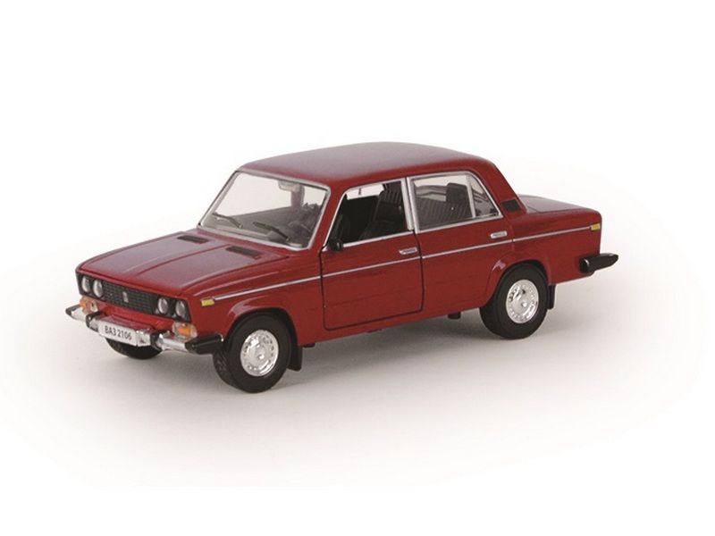 Модель изготовлена из металла с элементами пластика. У нее открываются двери, капот и вращаются колеса. Кроме того, игрушка оснащена инерционным механизмом, а также световыми и звуковыми эффектами (загораются фары и слышится звук открывания дверей), что делает игровой процесс еще более захватывающим. Машинка ВАЗ 2106 имеет три варианта расцветки.