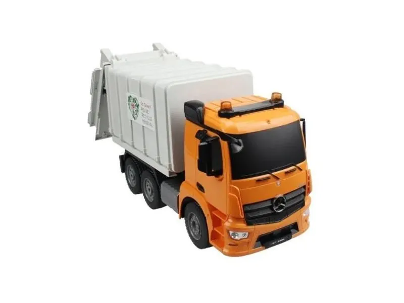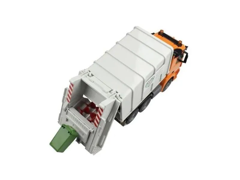 Мусоровоз от Double Eagle в масштабе 1:20 - модель реальной машины Mercedes-Benz Actros. Имеет множество подвижных деталей, световые и звуковые эффекты. Открывающиеся двери, загрузка и выгрузка мусора, два винтовых уплотнителя мусора, откидывающаяся кабина - это лишь немногое из возможных функций игрушечного автомобиля.