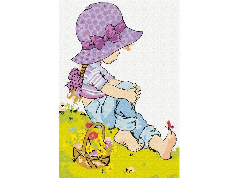 С помощью набора для творчества можно нарисовать картину в нежных цветах с изображением маленькой девочки, сидящей на полянке. Голову от солнца укрывает сиреневая панамка. Заплетенную косичку украшает бант в цвет панамки. Для такого творчества не требуются специальные художественные навыки. Нужно лишь следовать инструкции и время от времени сверяться с цветовой схемой рисунка.