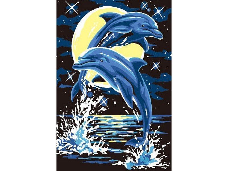 С помощью набора для творчества можно нарисовать двух дельфинов, выпрыгивающих из воды на фоне ночного неба. Для такого творчества не требуются специальные художественные навыки. Нужно лишь следовать инструкции и время от времени сверяться с цветовой схемой рисунка.