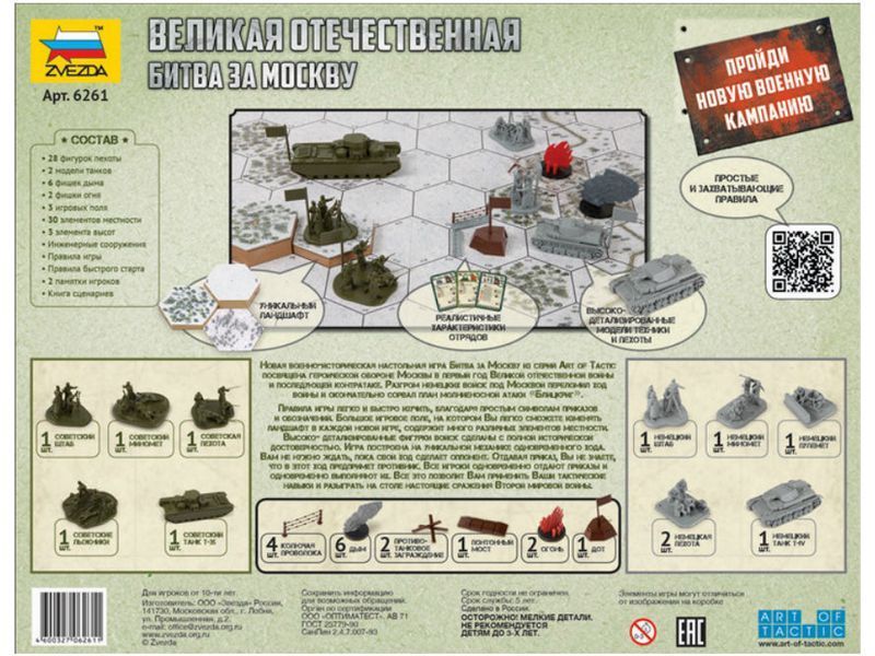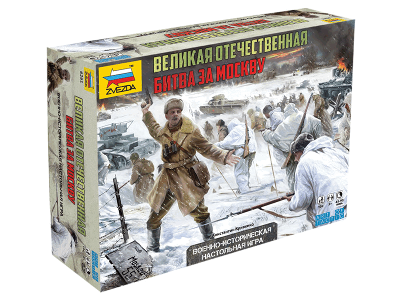 Военно-историческая настольная игра «Битва за Москву» из серии Art of Tactic посвящена героической обороне Москвы в первый год Великой отечественной войны и последующей контратаке. Разгром немецких войск под Москвой переломил ход войны и окончательно сорвал планы молниеносной атаки "Блицкриг". Правила игры легко и быстро изучить, благодаря простым символам приказов и обозначений. Большое игровое поле, на котором вы легко сможете изменять ландшафт в каждой новой игре, содержит много различных элементов местности. Высоко-детализированные фигурки войск сделаны с полной исторической достоверностью. Игра построена на уникальной механике одновременного хода. Вам не нужно ждать, пока свой ход сделает оппонент. Отдавая приказ, вы не знаете, что в этот ход предпримет противник. Все игроки одновременно отдают приказы и одновременно выполняют их. Все это позволит вам применять ваши тактические навыки и разыграть на столе настоящие сражения Второй мировой войны.