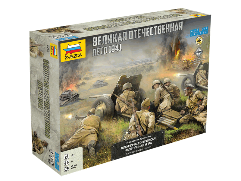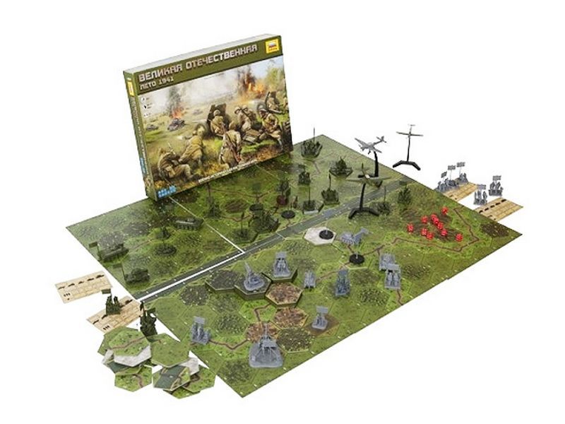 Настольная игра «Великая Отечественная. Лето 1941» - совершенно новое слово в современных военных играх! На столе развернётся захватывающий бой между частями Красной армии и Вермахтом. Все фигуры солдат и модели техники сделаны максимально приближенными к их прототипам, воевавших на полях Великой Отечественной Войны. Простые и доступные правила легко запомнить благодаря понятным символам приказов и обозначений. Большое поле позволяет игрокам принять участие не только в локальных стычках за удержание моста, но и больших сражениях Великой Отечественной Войны, перенесённых на стол. Дополнительные элементы местности и гексы высот позволяет изменить карту до неузнаваемости. Игра построена на уникальной механике одновременного хода. Теперь не нужно долго ждать, пока противник сделает свой ход! Игроки одновременно отдают приказы и одновременно их выполняют. Твой отряд всегда ответит огнём, даже в неравном бою!