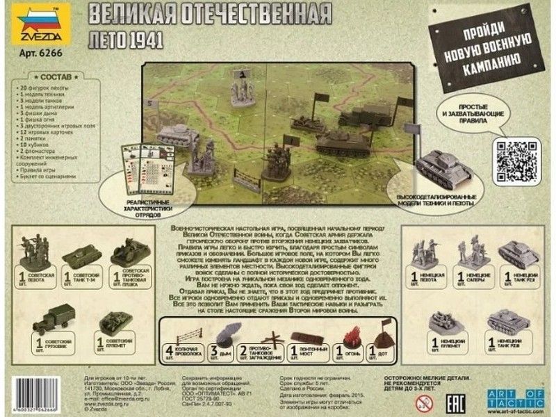 Базовый (стартовый) набор военно-исторической игровой системы «Великая Отечественная» (Art of tactic).В состав входят 20 фигур пехоты, 1 модель техники, 3 модели танков, 1 модель артиллерии, 3 фишки дыма, 3 двусторонних игровых поля, 12 игровых карточек, правила игры, буклет со сценариями, 2 памятки, 10 кубиков, 2 фломастера, комплект инженерных сооружений.