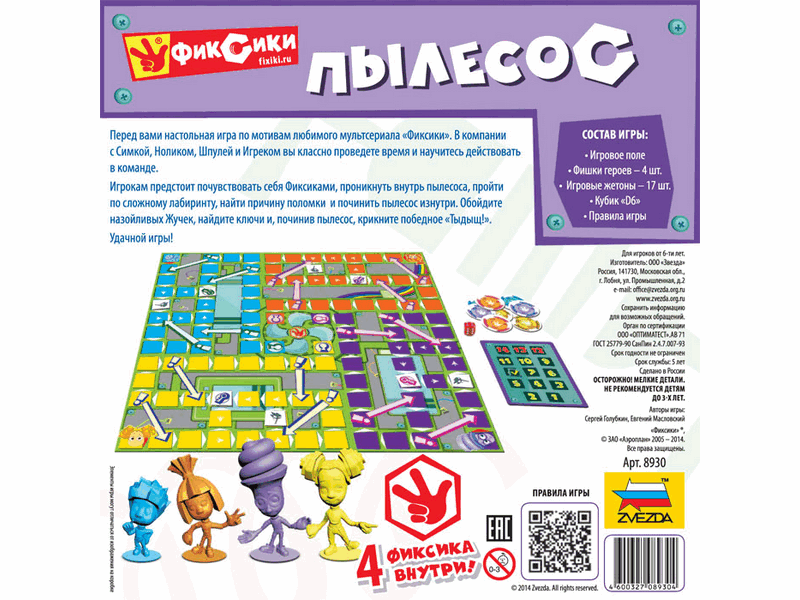 Перед вами настольная игра по мотивам любимого мультсериала «Фиксики». В компании с Симкой, Ноликом, Шпулей и Игреком вы классно проведете время и научитесь действовать в команде. Игрокам предстоит почувствовать себя Фиксиками, проникнуть внутрь пылесоса, пройти по сложному лабиринту, найти причину поломки и починить пылесос изнутри. Обойдите назойливых Жучек, найдите ключи и, починив пылесос, крикните «Тыдыщ!». Удачной игры.