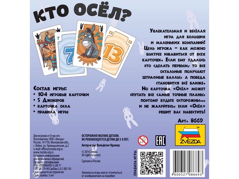 Только что до победы оставался один шаг… Но тут появился осел! И теперь придется все начинать сначала – ведь у игрока снова оказалась полная рука карточек! Цель каждого игрока - как можно быстрее избавиться от всех своих игровых карточек и не набрать штрафных очков. Как только один из игроков разыгрывает свою последнюю карточку, партия заканчивается. Каждая карточка, оставшаяся у игрока на момент окончания партии, приносит ему штрафные очки. При этом карточка «Осел» особенно опасна, т.к. сразу дает игроку 20 очков. Игрок, набравший меньше всех очков после заранее установленного количества партий, становится победителем. Увлекательная и веселая игра для больших и маленьких компаний!